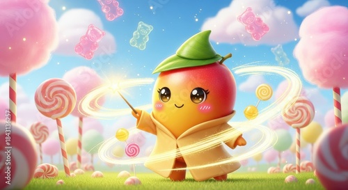 © Ariestia, Fototapeta premium Cute fruit character performs magic in a bright candy landscape