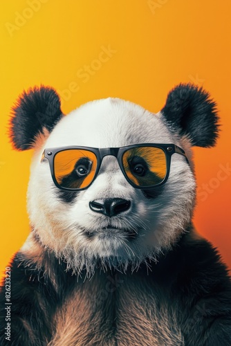 Fototapeta premium Cute funny animal panda in glasses on bright background, optics, funny...