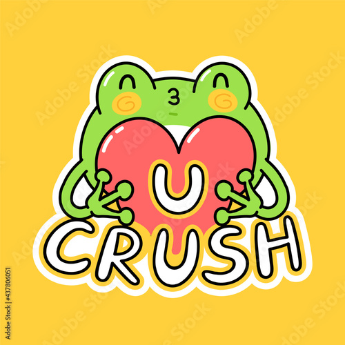 © svtdesign, Naklejka premium Cute funny frog hold heart. You crush slang quote. Vector hand drawn cartoon kawaii character illustration sticker. Funny cartoon toad frog mascot character print for t-shirt, poster concept
