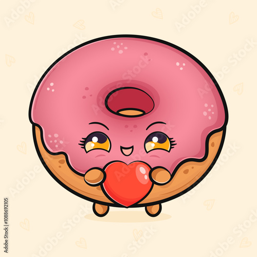 Fototapeta premium Cute funny pink Donut with heart in hand. Vector hand drawn cartoon kawaii...