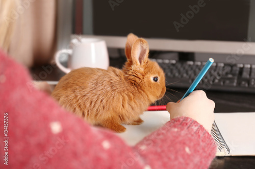 Obraz premium Cute funny rabbit sitting on notebook and woman at desk