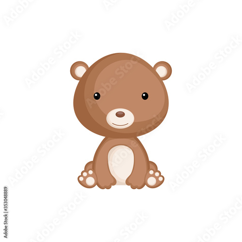 © Jexy, Obraz premium Cute funny sitting baby bear isolated on white background. Woodland adorable animal character for design of album, scrapbook, card and invitation. Flat cartoon colorful vector illustration.
