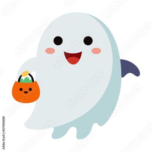 Obraz premium Cute ghost holding a pumpkin candy bucket