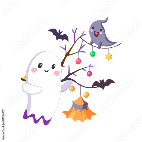 © PixelNest Media, Fototapeta premium Cute ghost with a tree and bats isolated on white background
