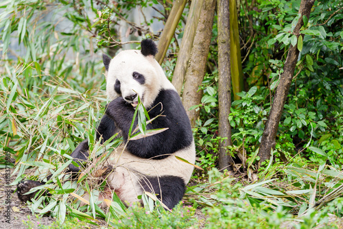 © Jo Panuwat D, Fototapeta premium Cute Giant Panda, Ailuropoda melanoleuca or panda bear in forest at Chengdu Panda Breeding Research Center Dujiangyan. landmark and popular for tourists attractions in Chengdu, China.
