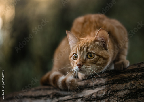 Fototapeta premium Cute ginger cat sitting on a tree branch. Smart cat carefully looks at the world. The cat is preparing to jump by flexing its back. Red cat in a forest on a tree. The animal listens carefully.