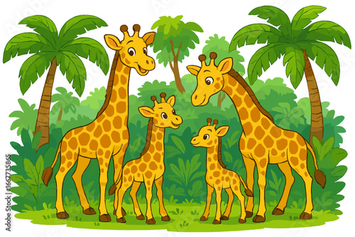 © Karyna, Fototapeta premium Cute giraffe family with parents and young calves in a vibrant jungle. Cartoon vector illustration of wildlife animals in African safari habitat with palm trees. Happy animals.