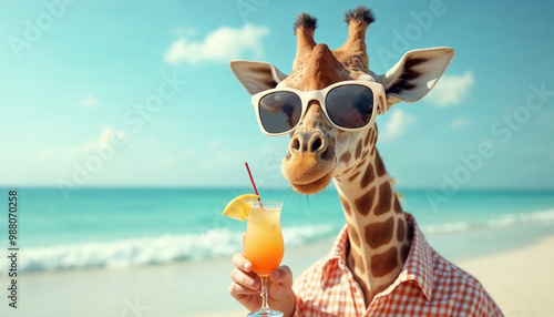 © My Ai, Obraz premium Cute giraffe wearing sun glasses holding cocktail at the beach