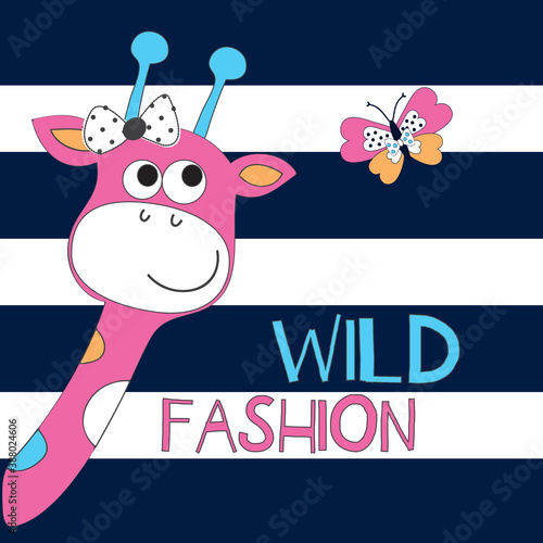 © yoliana, Naklejka premium cute giraffe with butterfly on striped background