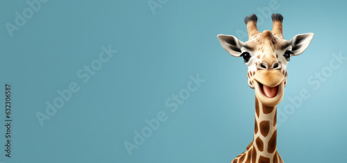 © Lubo Ivanko, Naklejka premium Cute giraffe with happy positive smiling expression. Wide banner copy space on side. Generative AI