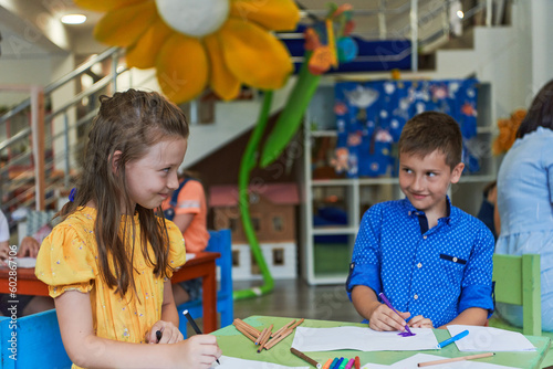 Fototapeta premium Cute girl and boy sit and draw together in preschool institution