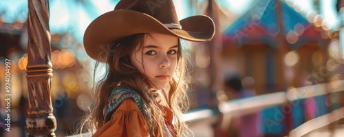 Obraz premium Cute girl dressed as a cowboy, posing happily at a famous theme park.