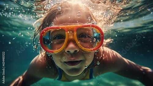 Fototapeta premium Cute girl having fun underwater in the pool with swimming goggles. Summer holiday vacation. Little kid diving into water. Children water sport.