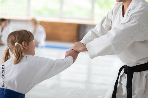 Fototapeta premium Cute girl preparing for sport competition practicing aikido