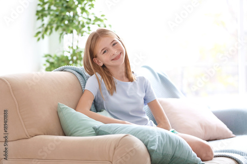 Fototapeta premium Cute girl resting on couch with soft pillows
