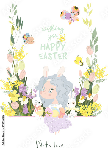 © Maria Starus, Obraz premium Cute Girl sitting with White Bunnies and holding Easter Eggs in Spring Flowers. Vector Illustration