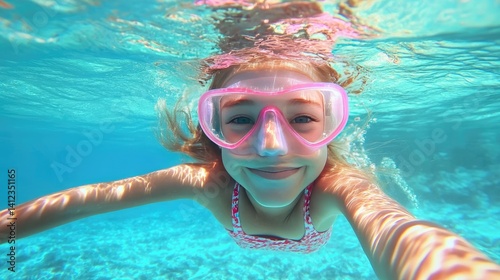 © Lilly, Fototapeta premium Cute girl swimming underwater in clear blue waters
