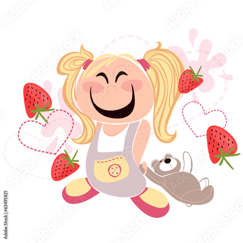 Fototapeta premium cute girl with bear on the yogurt and strawberry background