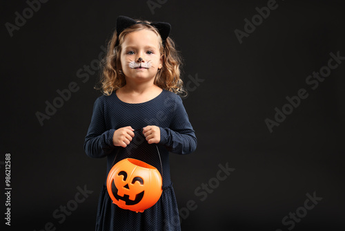 Fototapeta premium Cute girl with pumpkin bucket dressed like cat for Halloween celebration on black background, space for text