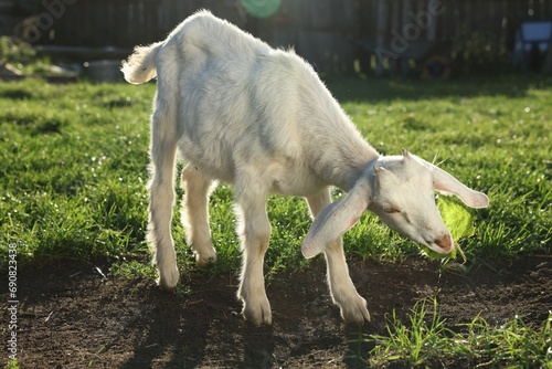 Fototapeta premium Cute goat grazing at farm on sunny day