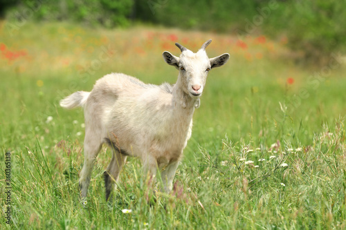 Obraz premium Cute goat in green field. Animal husbandry