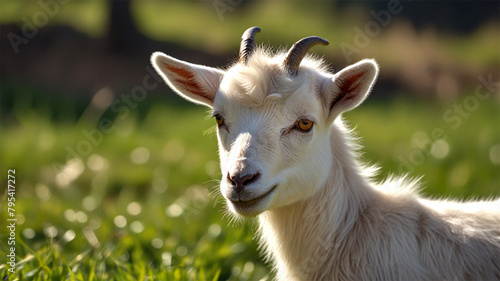 © Olga, Obraz premium Cute goat kid on green spring grass in sunny day