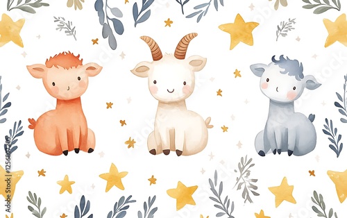 © Indri, Naklejka premium Cute goats, floral pattern, whimsical background, digital art, children's decor