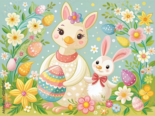 © prapatsorn, Obraz premium Cute Goose and Bunny Happy Easter Print in Pastel Colors Mom and Baby