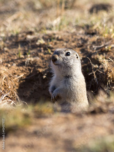 © Iuliia, Fototapeta premium Cute Gopher or Ground squirrel looking out from his hole. Wildlife or Earth Day concept.