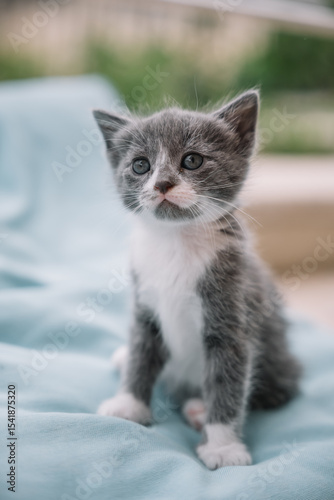 Obraz premium Cute gray and white kitten sitting on a soft blanket in a sunny indoor space