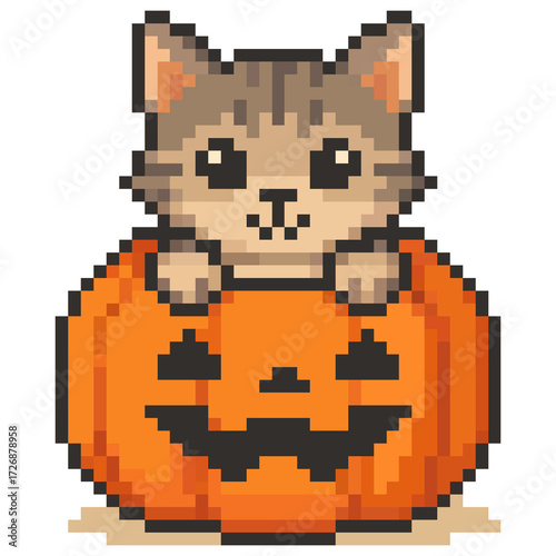 Fototapeta premium Cute gray cat peeking from smiling orange Halloween pumpkin in pixel art style