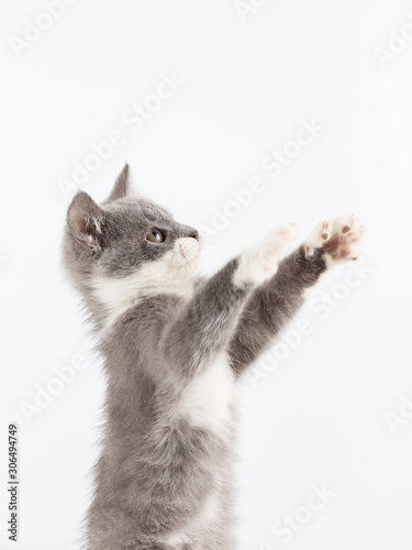 © Plutmaverick, Fototapeta premium Cute gray kitten playing funny and fun on a white background.