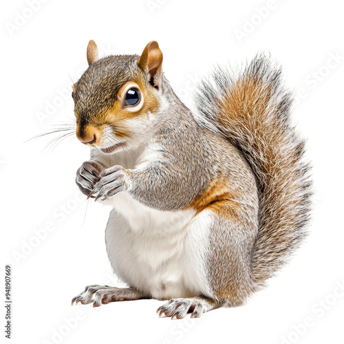 © Anutha, Fototapeta premium Cute gray squirrel sitting with paws clasped and fluffy tail raised