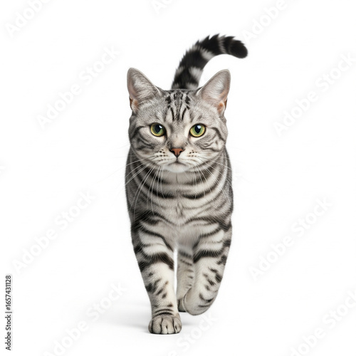 Obraz premium Cute gray tabby cat walking directly towards the camera on an isolated...
