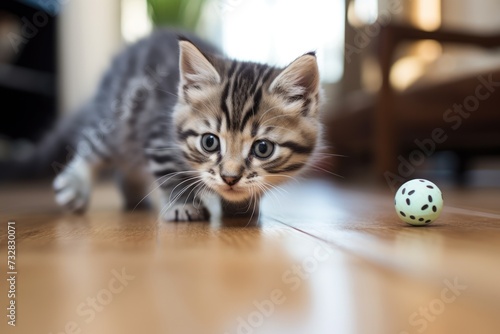 © EarthWalker, Naklejka premium Cute gray tabby kitten playing with a ball on the floor. Playful cat in the house. Pet indoors. AI Generated