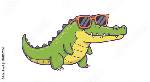 © loc, Naklejka premium Cute Green Crocodile Wearing Orange Sunglasses