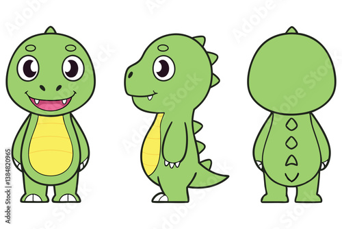 Obraz premium Cute Green Dinosaur Character Design with Transparent Background, Front, Side and Back Views