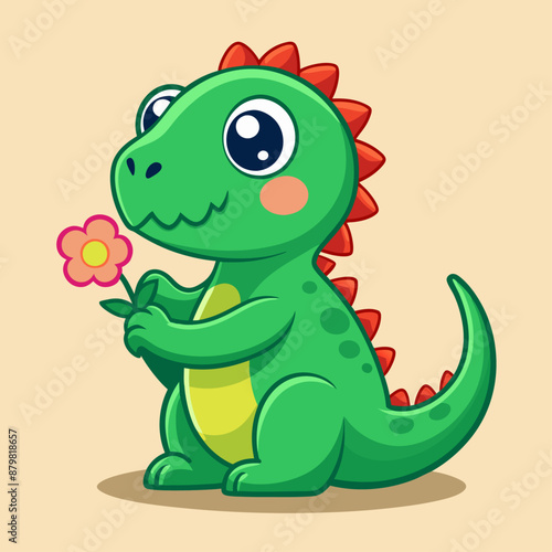 © Anastasia, Fototapeta premium Cute green dinosaur He holds it in his paws flower