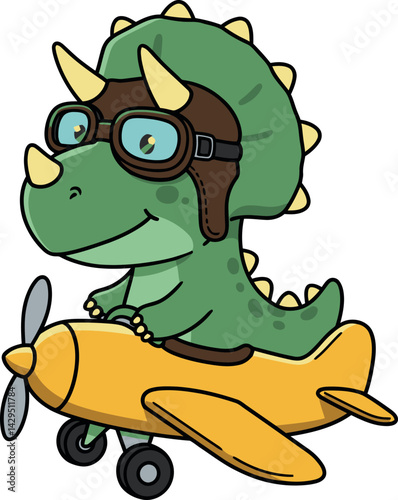 Obraz premium Cute green dinosaur pilot flying yellow airplane cartoon vector illustration