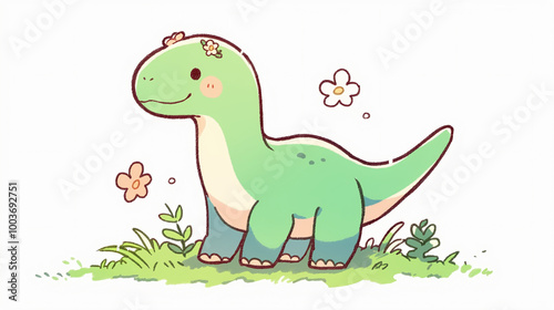 Naklejka premium Cute Green Dinosaur with Flower Crown - Fantasy Animal Illustration