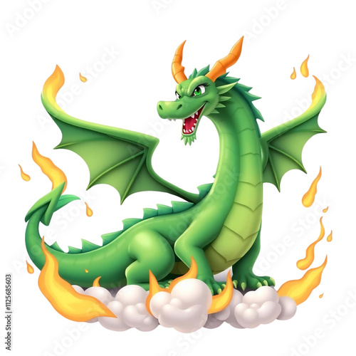 © CooLKenG, Fototapeta premium Cute Green Dragon Fantasy Illustration Mythical Creature Fire Clouds Wings