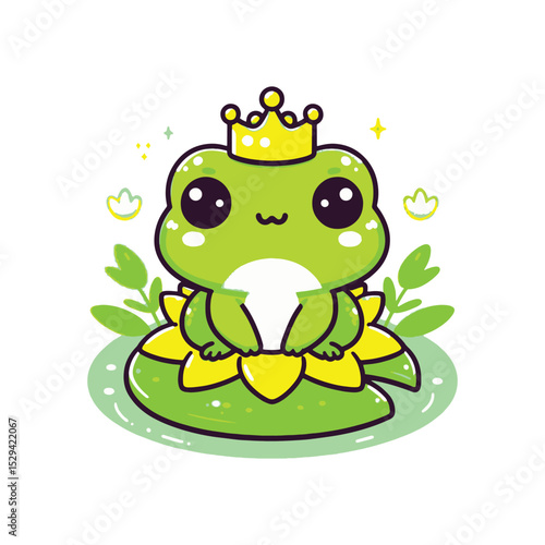 © attha, Obraz premium Cute green frog wearing a crown on a lily pad