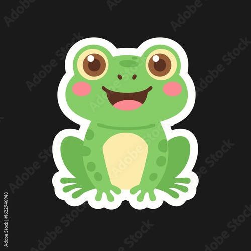 Fototapeta premium Cute green frog with a happy smile and pink cheeks sitting against a black...