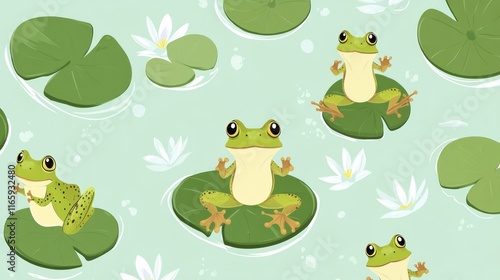 Fototapeta premium Cute green frogs meditating on lily pads in a pond.