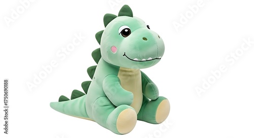 © Bikash, Obraz premium Cute green plush dinosaur toy sitting against a white background