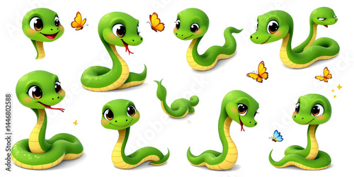 © ENDRY, Obraz premium Cute Green Snakes Collection with Butterflies Cartoon Vector Art
