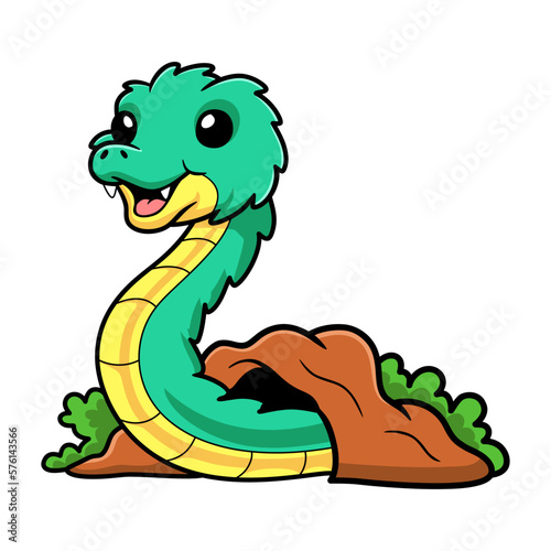 Fototapeta premium Cute green spiny bush viper cartoon out from hole