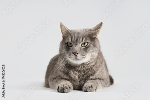 © Pixel-Shot, Obraz premium Cute grey cat lying on light background
