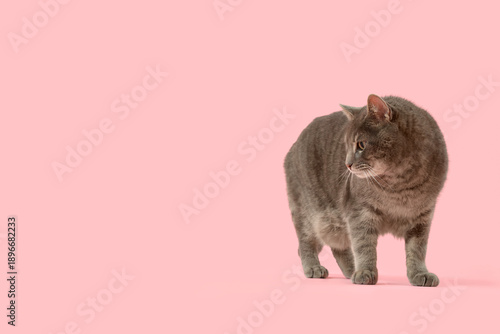 Obraz premium Cute grey cat on pink background