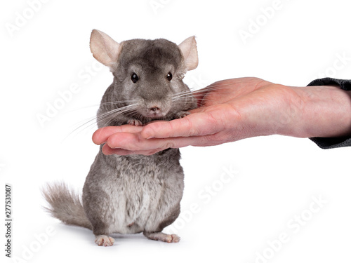 © Nynke, Obraz premium Cute grey Chinchilla, standing facing camera on hind paws, leaining on human hand. Isolated on white background.